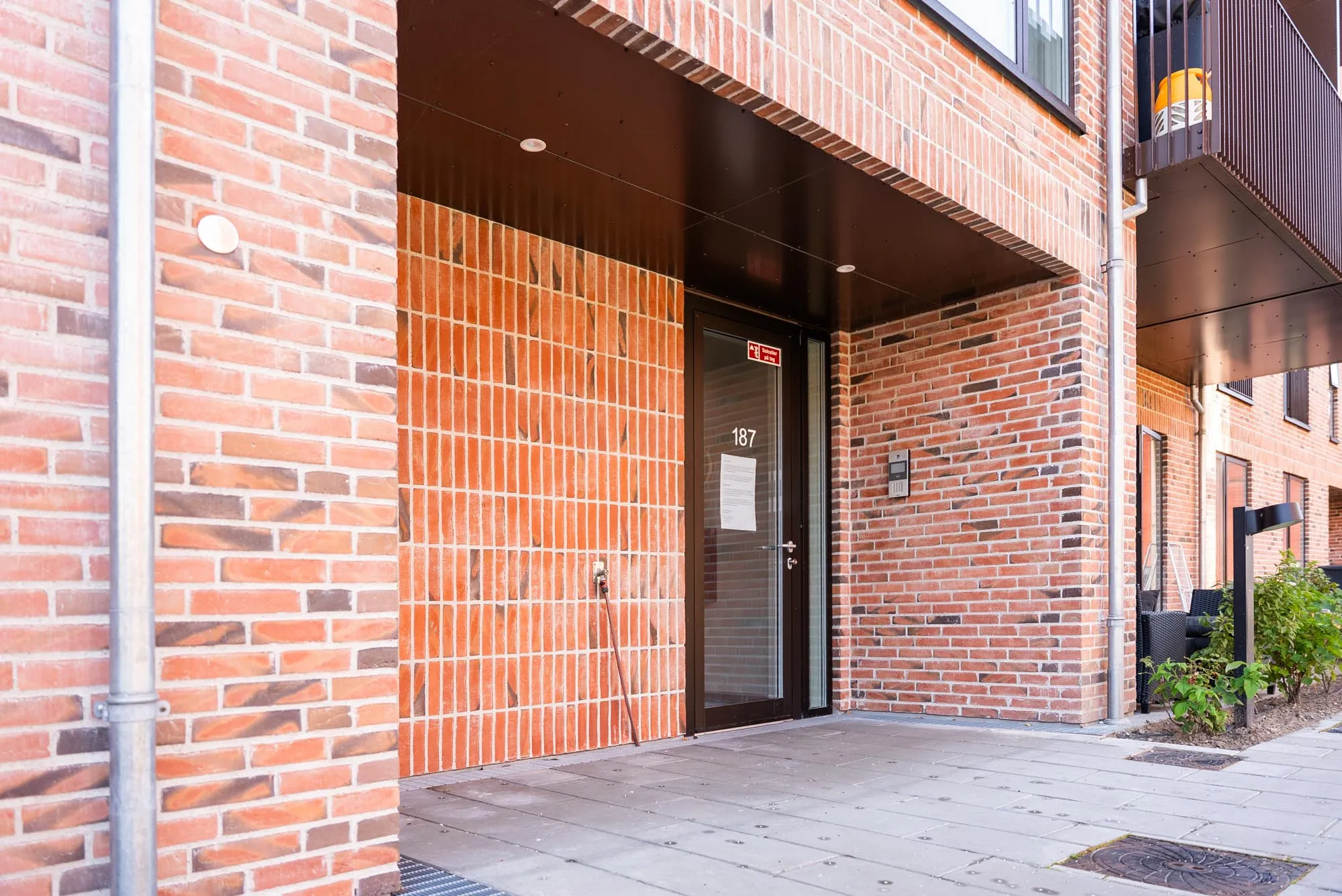 Facaderne består af murværk med en bred variation af rulleskifter og mønstermurværk, som giver byggeriet en høj arkitektoniskkvalitet. Som supplement til murværket er der udført felter i lakeret aluminiumsplader på både facader og loft.