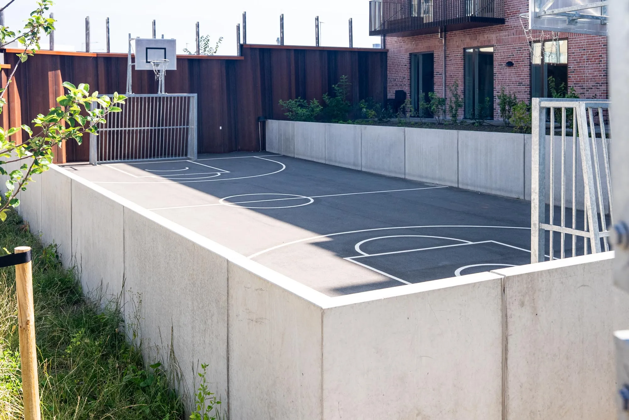 Mod Grenåvej er der udført støjskærme af hhv. spunsvægge med glas og stålrammer med lister og beplantningsamt et landskabeligt gårdrum med ophold rundt om og mellem bygningerne. I gårdhaven er etableret en nedsænket boldbane, der samtidig fungerer som forsinkelsesbassin som supplement til rørbassin under indkørslen.