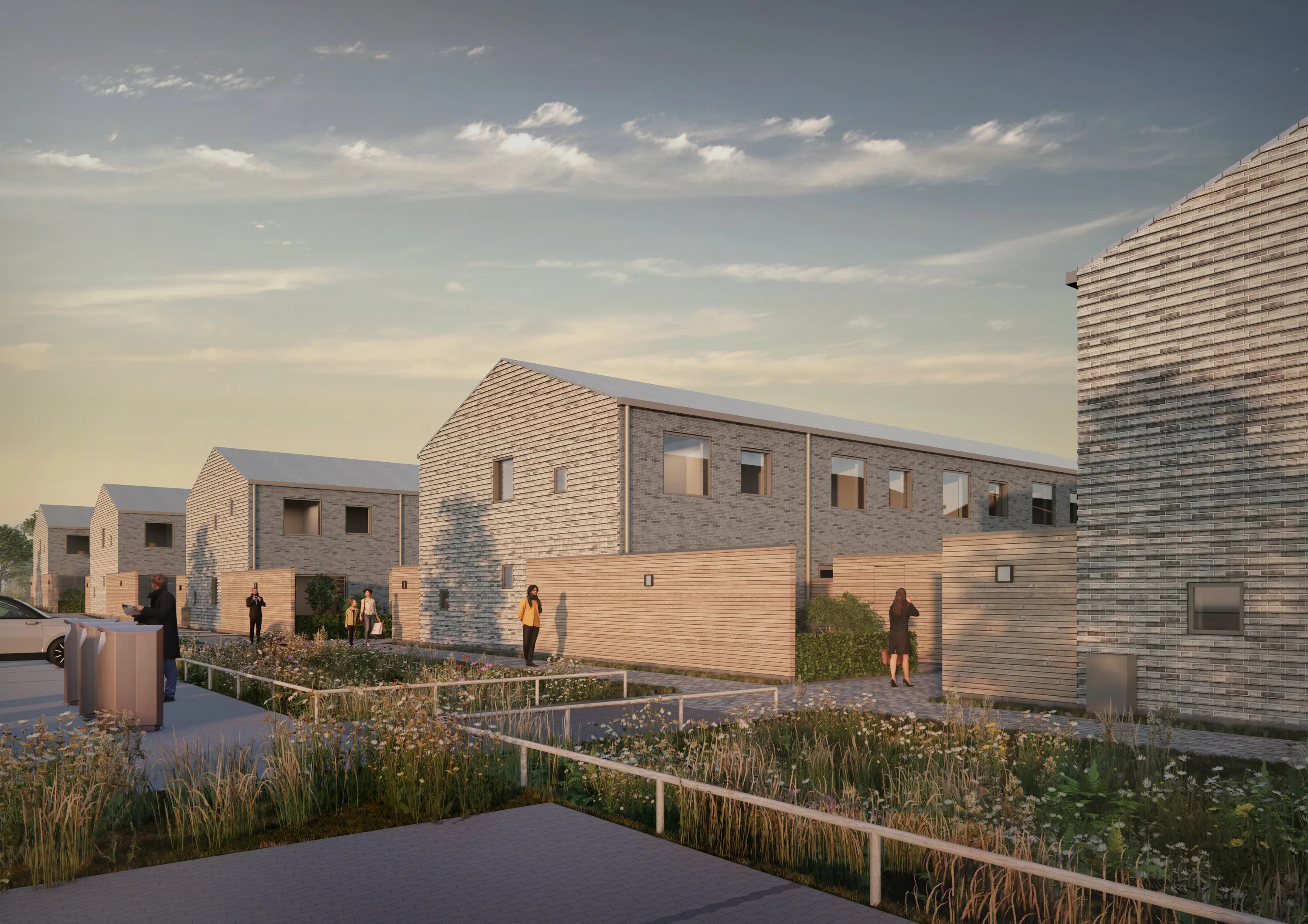 Der er opført skure og hegn medbeklædning i Thermofyr med vandrette spor, som en naturlig og integreret del af støjafskærmningen mod Grenåvej. På alle skure er der udført mossedum tag og faste bænke, som skal opfordre beboere til ophold og fællesskab. Der er etableret 2 fælles molokanlæg til affaldshåndtering.