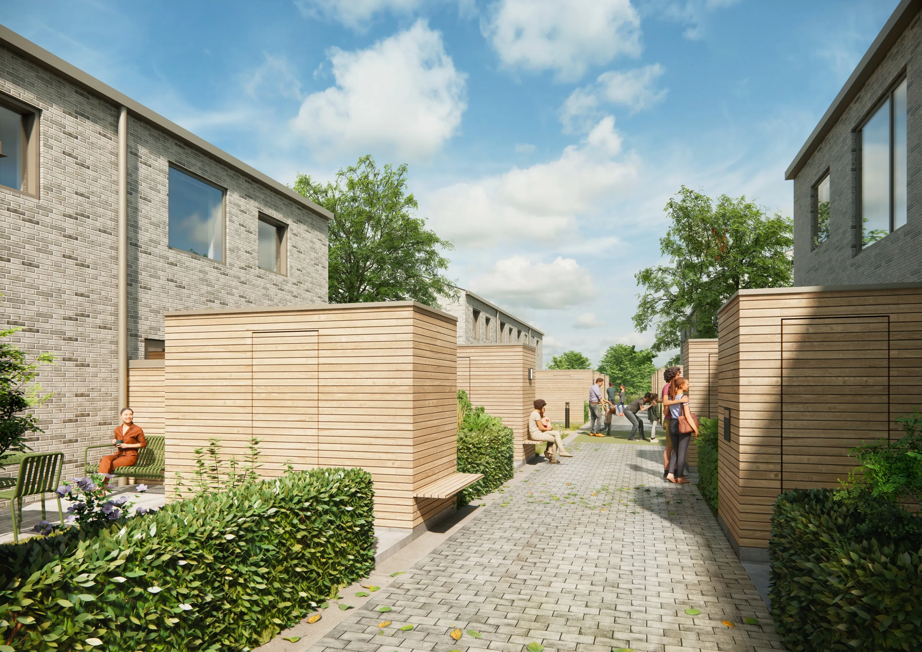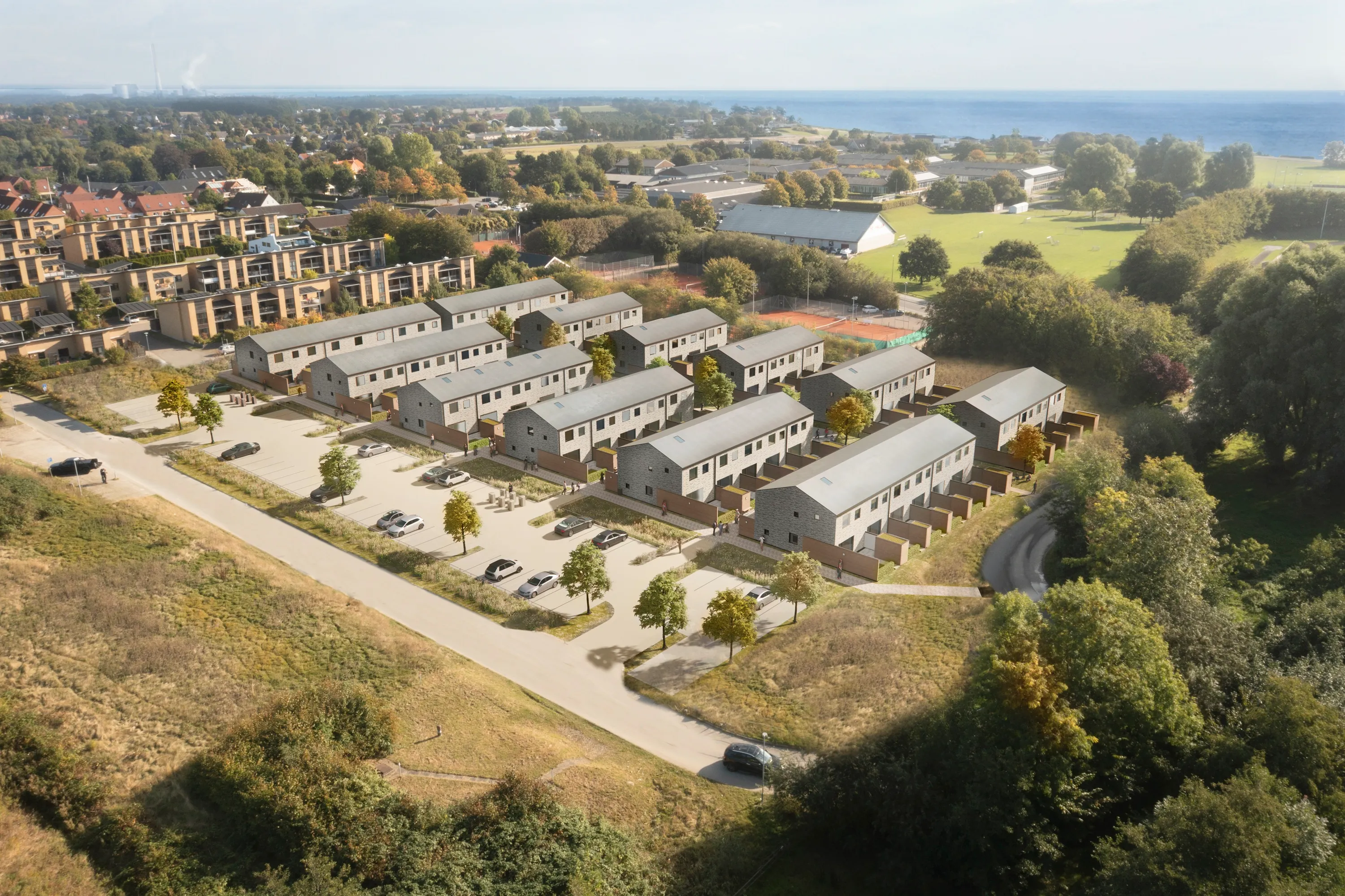 Alle boliger er udført med egen for- og baghave i et hyggeligt og tryghedsskabende miljø. Derudover er der etableret et grøntmellemrum ”fælled” med varierende landskabelige temaer over elementerne jord, vand, luft og ild.