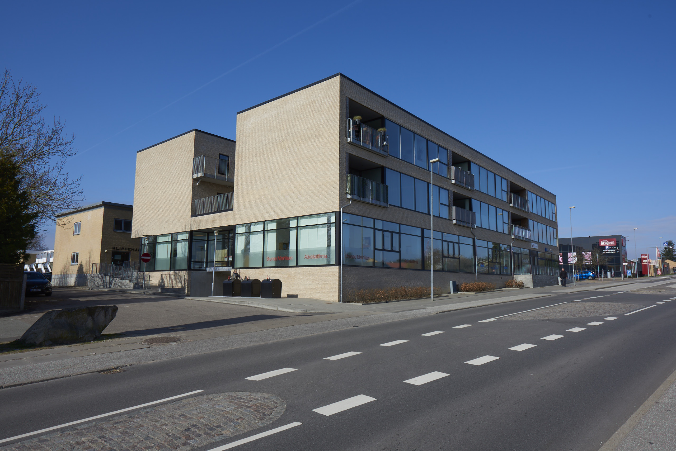 På torvet i Hørning midtby har Cj Group opført et butikscenter med 900 m² butikslejemål i stueetagen samt i alt 16 lejeboliger fordelt på 1. og 2. sal.